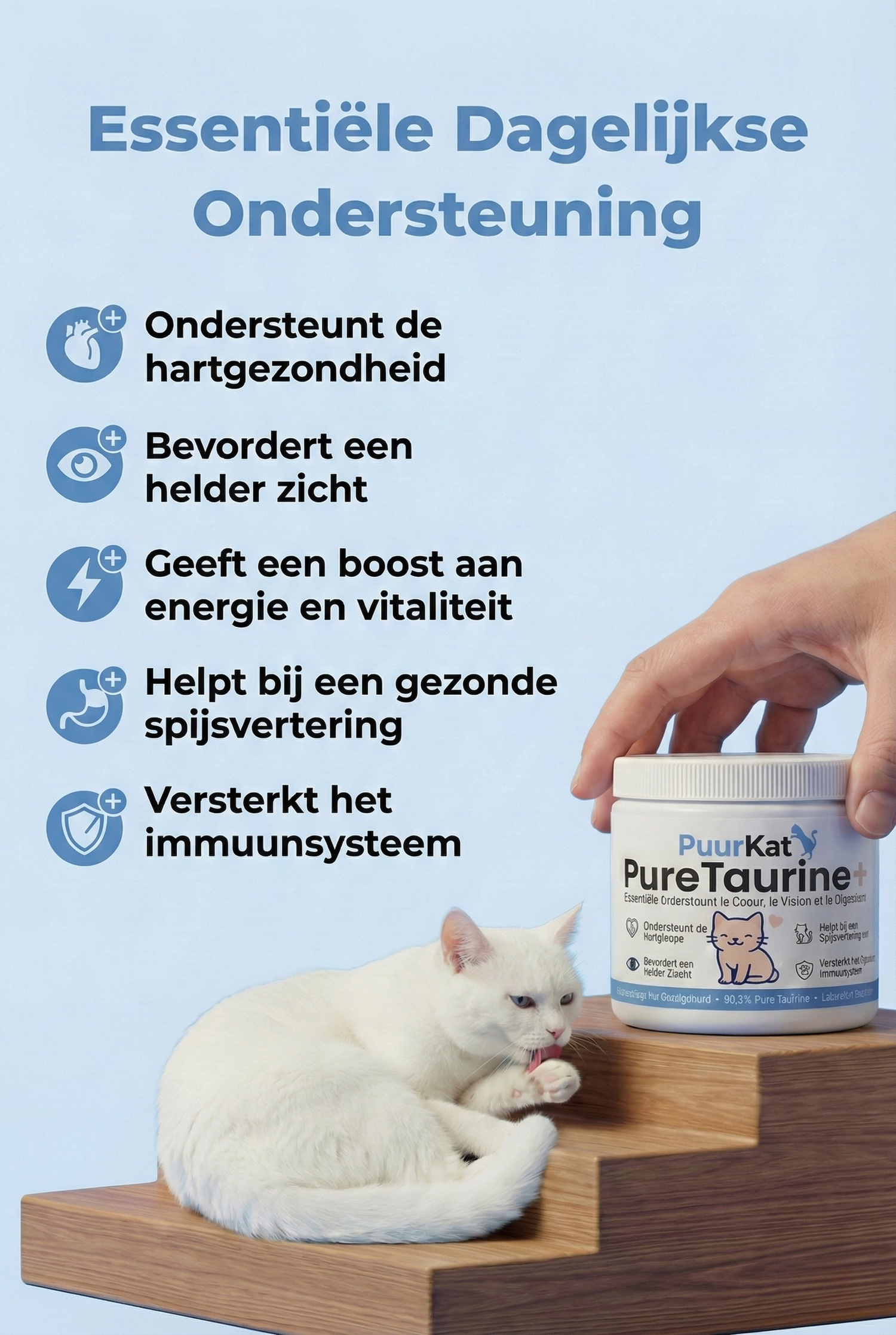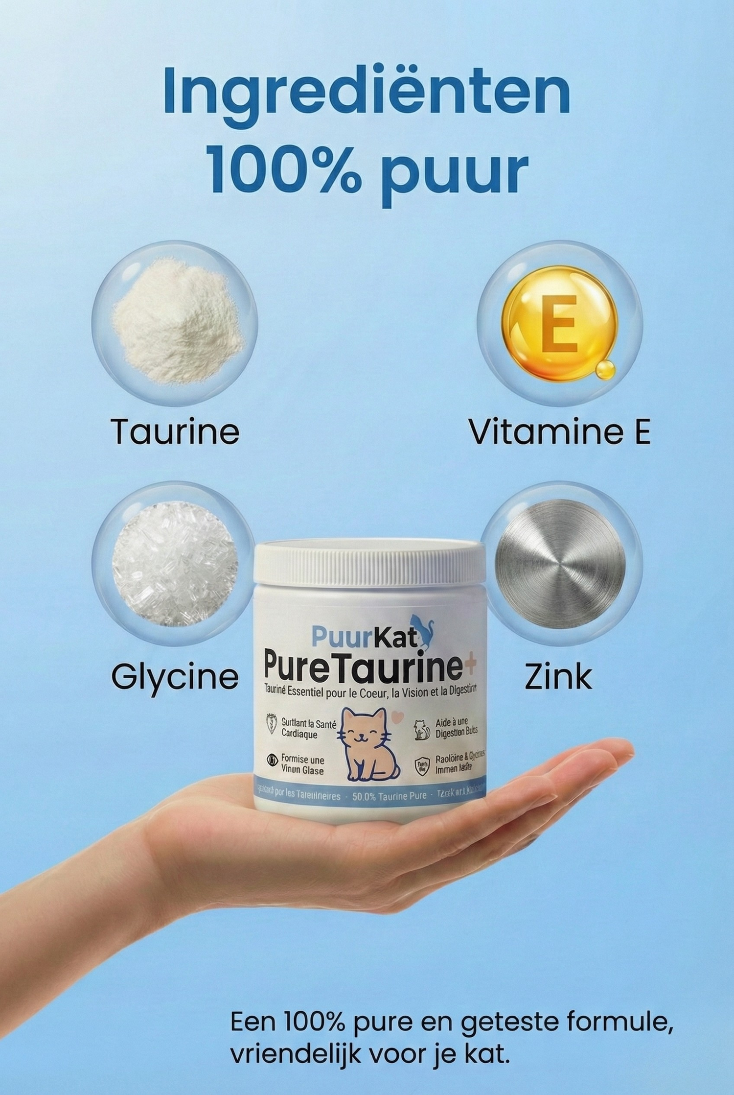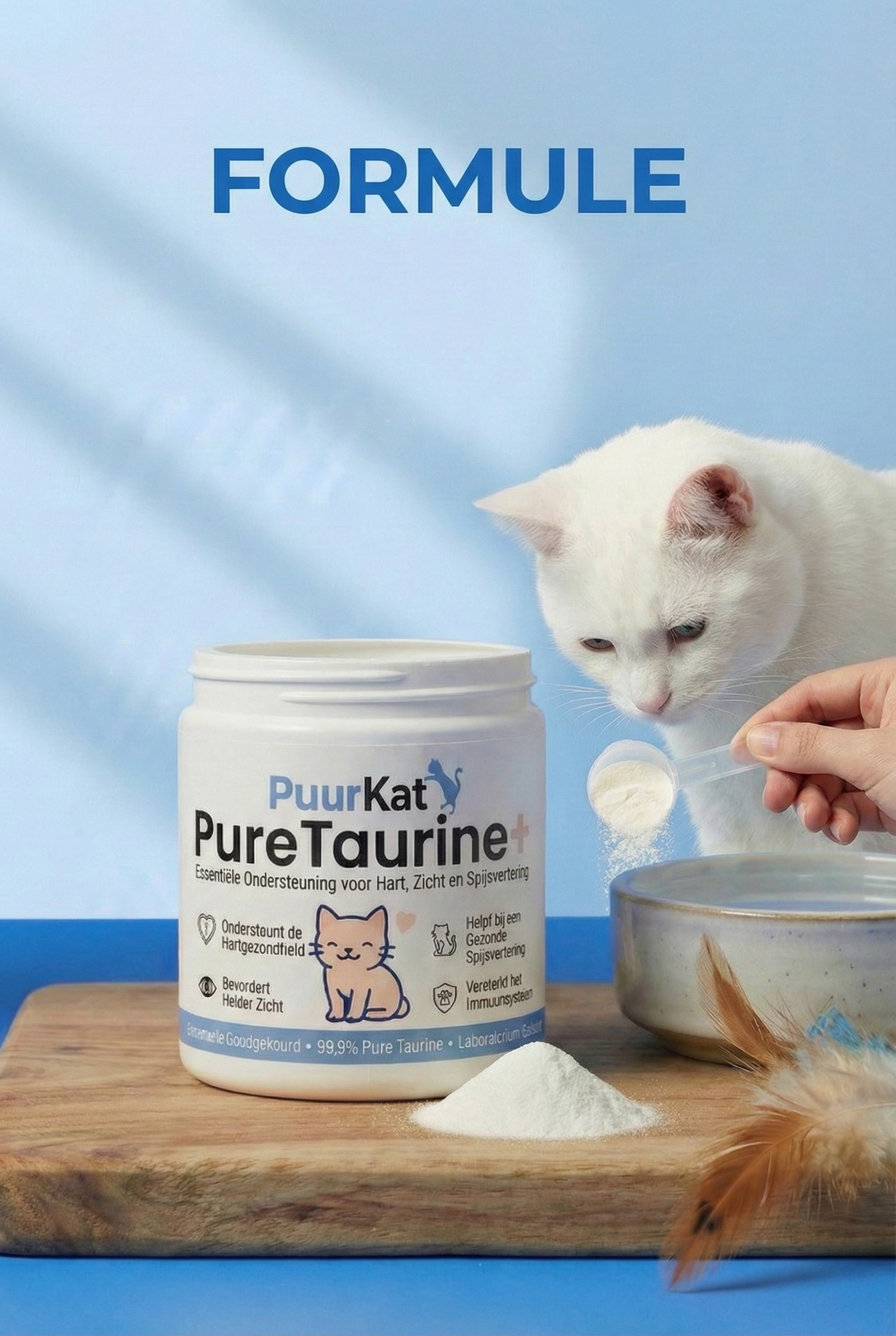 Slechts één schepje PureTaurine+, gemengd door het voer van je kat, levert de essentiële taurine die het lichaam niet zelf kan aanmaken.