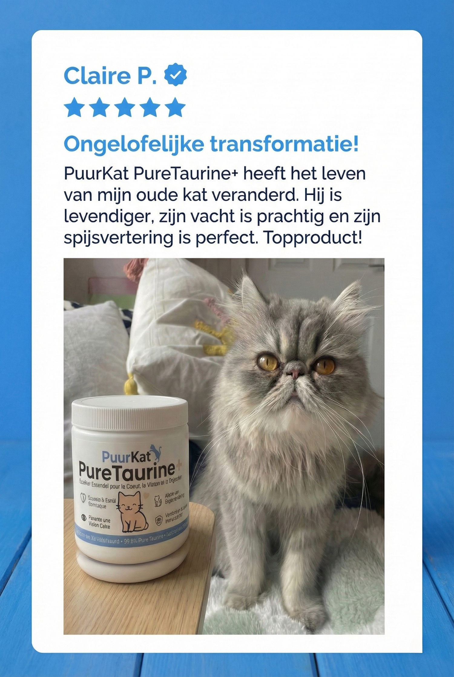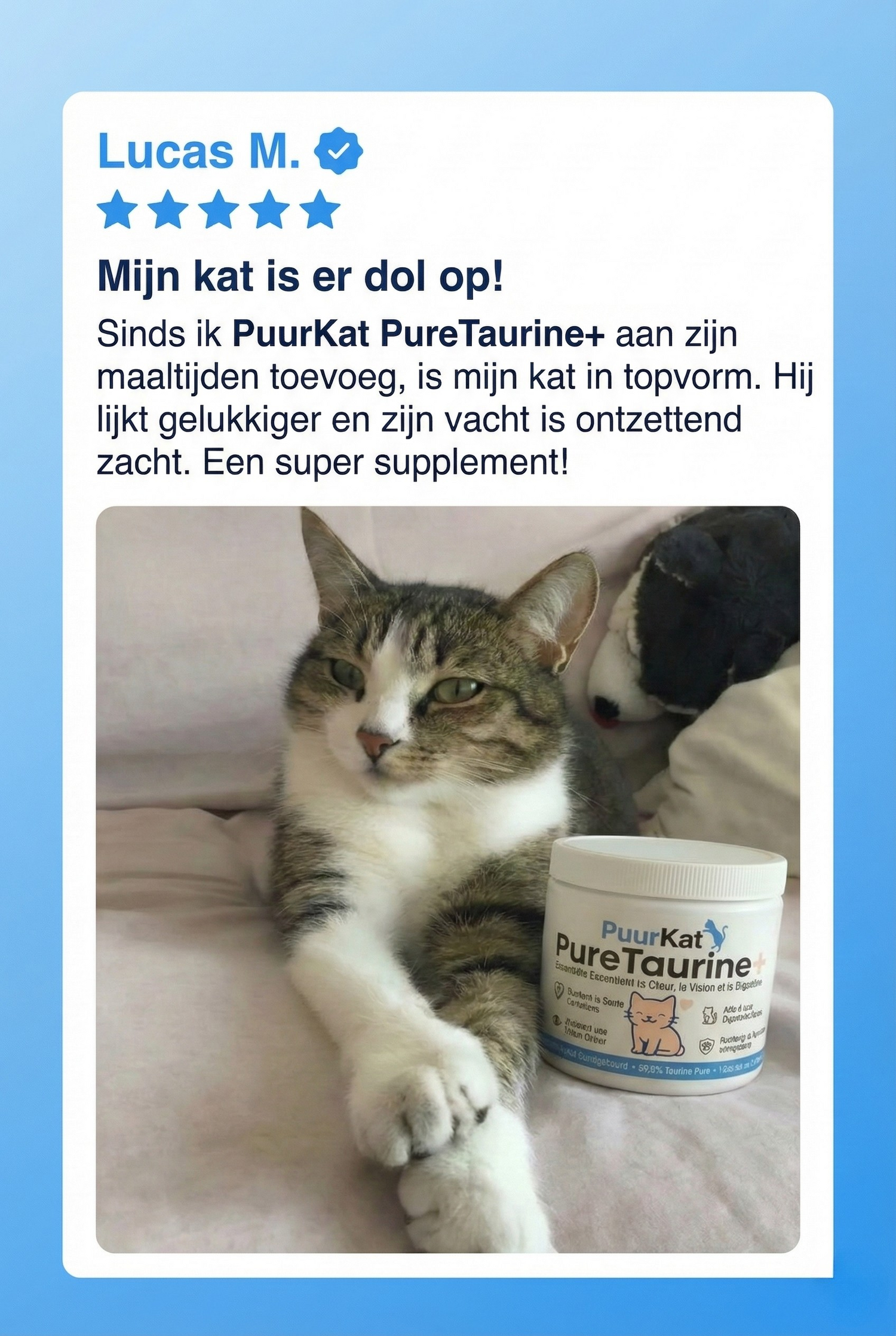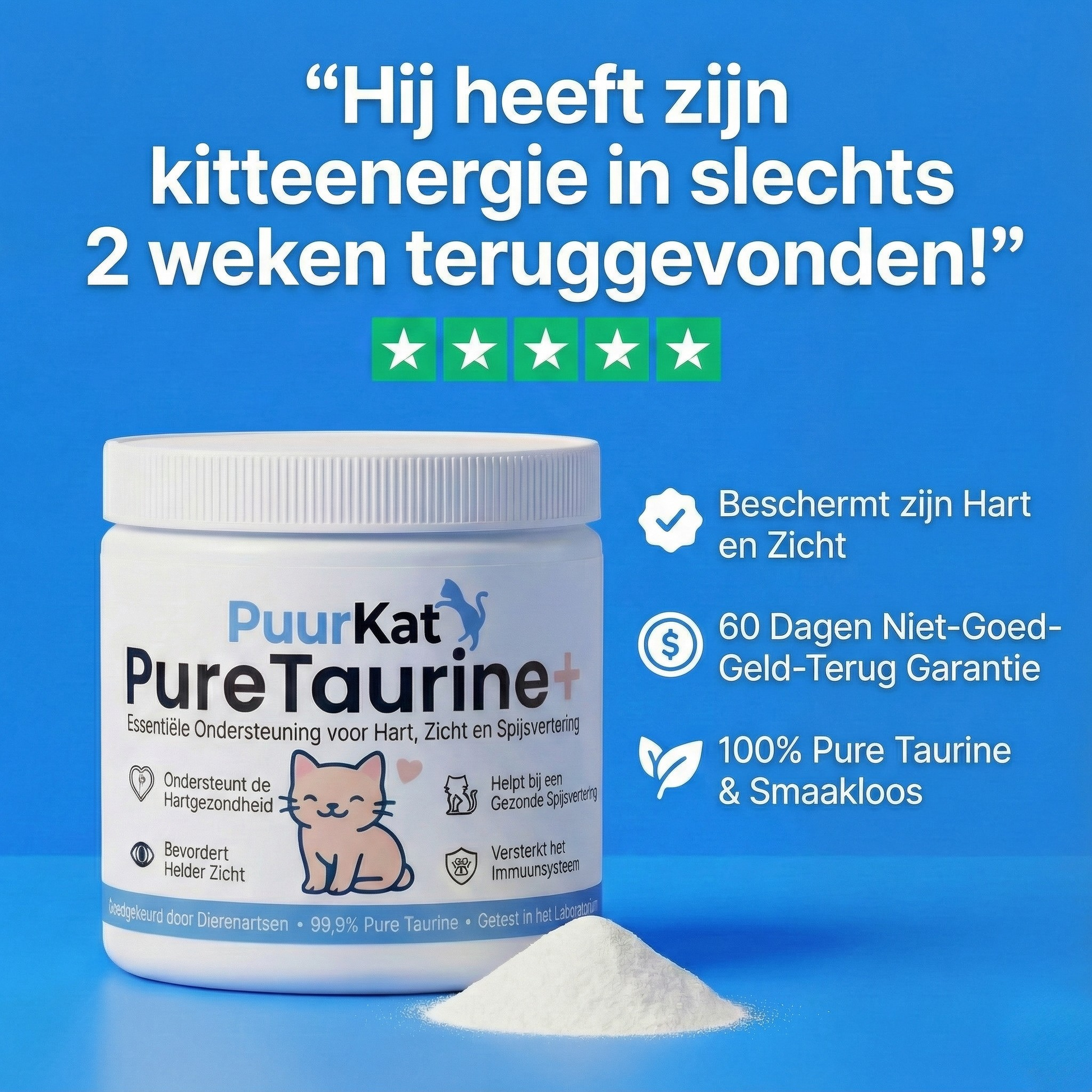 Het toevoegen van PuurKat Taurine+ aan de voeding is een kleine dagelijkse moeite om de gezondheid van je kat op de lange termijn te beschermen.